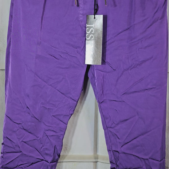Super bequeme Hose, stretchig, glänzender Stoff mit Kordel- und Gummizug. Seitliche Schlupftaschen vorne und aufgesetzte Taschen hinten.